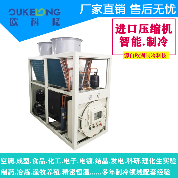 風(fēng)冷箱式防爆冷水機(jī),是歐科隆制冷打開(kāi)市場(chǎng)的拳頭產(chǎn)品,歐科隆制冷擁有廣泛的防爆冷水機(jī)配套經(jīng)營(yíng),包括臭氧發(fā)生器,甲烷發(fā)電,化工化纖,石油天然氣,新型環(huán)保行業(yè)等,歐科隆防爆冷水機(jī)采用隔爆、增安、本安、正壓、充油、充砂、無(wú)火花、澆封和氣密等多種防爆方式,使機(jī)組可以在易燃易爆場(chǎng)合使用。